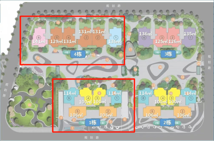 项目将规建4栋住宅楼,而届时开盘首推的为1#、4#。从示意图可以得知,首推的1#、4#已经涵盖了建面约100-141m²的三至四房。