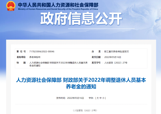 经党中央、国务院批准,人力资源社会保障部、财政部近日印发《关于2022年调整退休人员基本养老金的通知》。