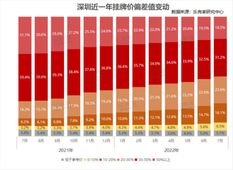 据乐有家研究中心统计,过去近一年,深圳挂牌价与参考价差距在10%以内的房源增加一倍,挂牌价高于参考价3成以下占比由1年前的30%左右增长至50%左右,说明挂牌价接近参考价的房源增多,更多业主降低预期,参考价成为买卖双方博弈的重要参考线。值得注意的是,7月深圳有约6成二手房以接近参考价成交。