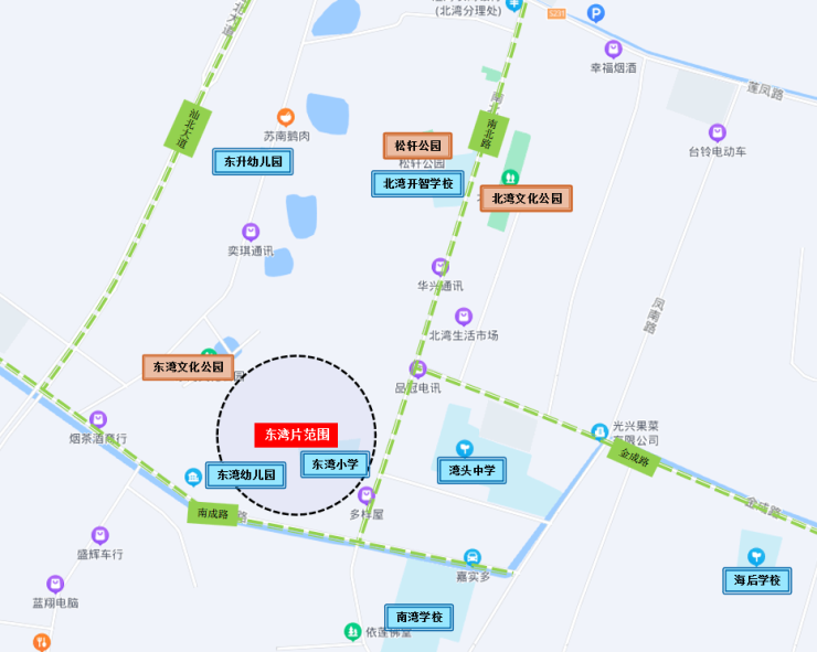摊开地图能发现,教育配套当属该片区内一大优势,在片区周边就有东湾幼儿园、东湾小学、湾头中学、南湾学校四所学校环绕。