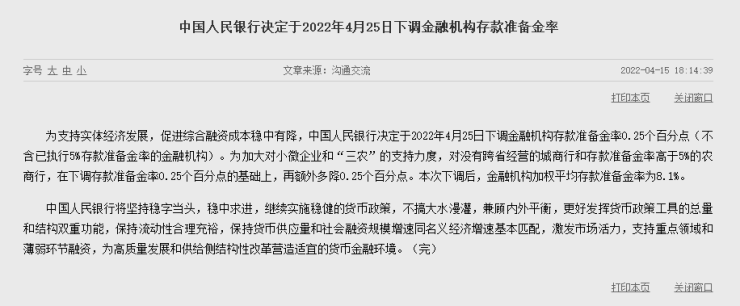 昨天(4月15日),央行发布消息称,为支持实体经济发展,促进综合融资成本稳中有降,中国人民银行将于4月25日下调金融机构存款准备金率0.25个百分点(不含已执行5%存款准备金率的金融机构)。