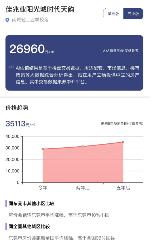 基于以上数据综合分析,每经AI品房小程序测算,未来五年佳兆业阳光城时代天韵房价有望达到35111元/平方米,房价会跑输东莞市平均涨幅,仅高于东莞市10%的小区。