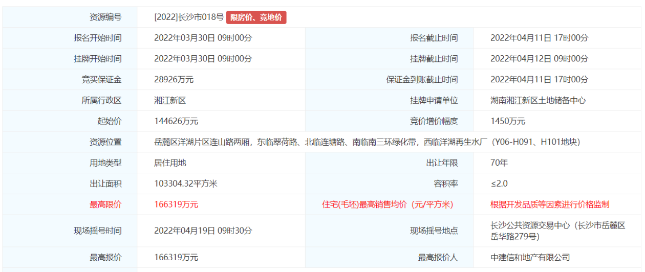 位于岳麓区滨江新城的长沙市017号地块共有14家竞买人参与现场摇号,招商蛇口最终以13.88亿元摘得该地,楼面价约8050元/㎡,溢价率15%;位于岳麓区洋湖片区的018号地块共有2家竞买人参与现场摇号,最终由中建信和摘得,成交价格16.63亿元,溢价率15%,折合楼面价8050元/平方米。