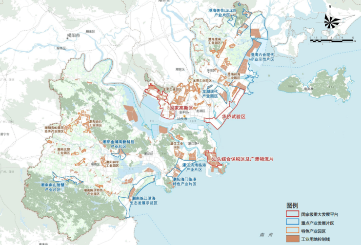 其中,“一心”为打造更高能级功能的中心城区;“两带”为支持汕头空间拓展的发展、提升带;“一轴”为促进高端要素集聚城市发展中轴;“四组团”为承接中心城区发展动能,通过南北两翼统领外围区县一体化发展。(澄海组团、潮阳组团、潮南组团、南澳组团)