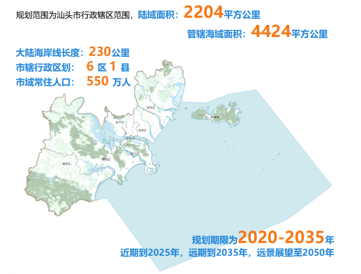 规划范围为汕头市行政辖区范围,陆域面积:2204平方公里;管辖海域面积4424平方公里;大陆海岸线长度:230公里;市辖行政区划:6区1县;市域常住人口:550万人。
