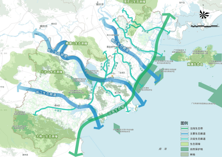 其中,“一带”为沿海生态带;“三廊”为以河流水系形成三条生态走廊;“四屏”为牢固四大山体生态保护屏障;“一岛”为严格保护南澳生态岛。