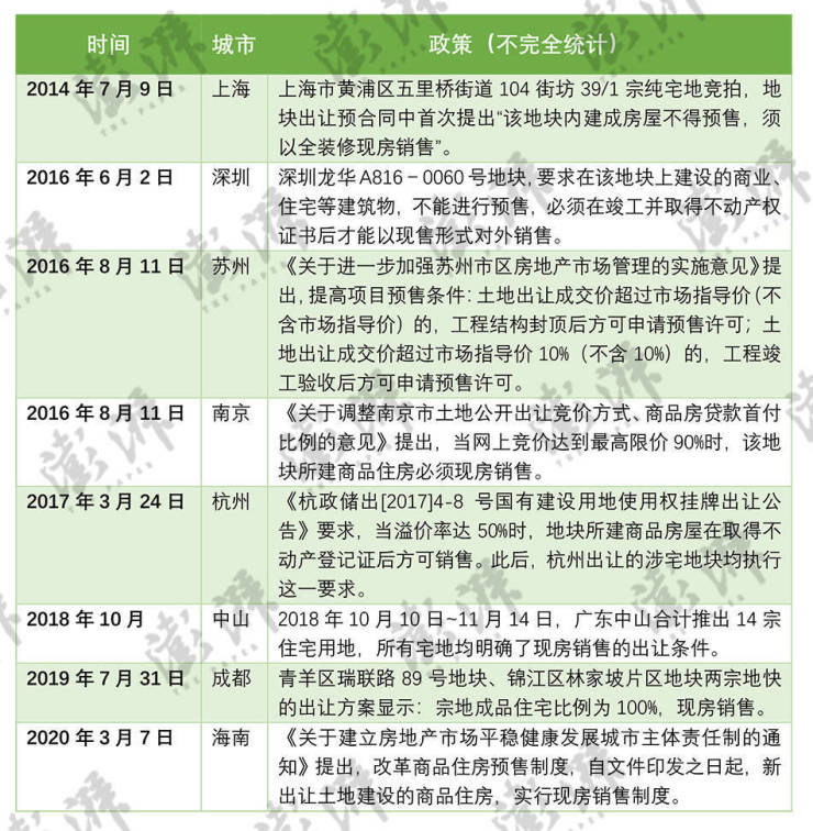 据不完全统计,2016年至2020年间,房地产市场活跃度较高,深圳、苏州、南京、杭州、中山、成都、海南等城市在土地端设置现房销售条件,抑制土地市场热度。