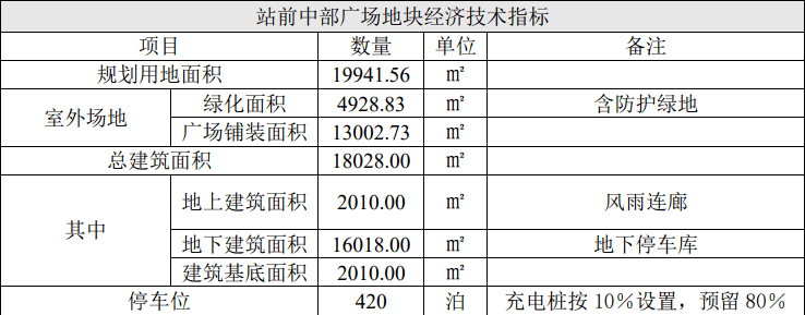 站前中部广场地块呈规整的长方形用地,规划占地面积为19941.56平方米,总建筑面积约18028平方米。