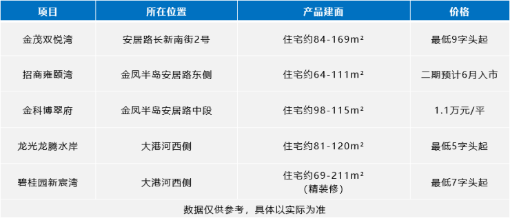 据了解,目前金凤半岛内共有3个新盘在售,分别为金茂双悦湾、招商雍颐湾,以及金科博翠府。而周边区域则有2个新盘在售,分别为龙光龙腾水岸、碧桂园新宸湾。