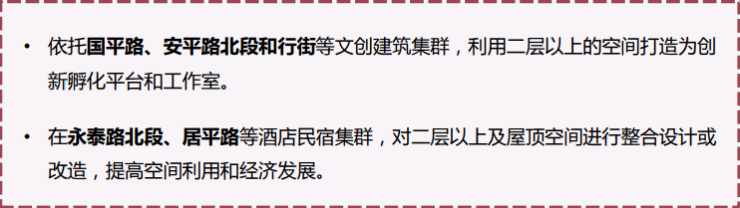 采用弹性引导原则,构建文化魅力彰显的历史商圈,适当植入新型 业态,赋能街区商业发展,促进街区聚集人气、快速成势,激发街区商业活力。将主要步行街及转角建筑划定为重点管控地段,聚焦符合历史街区特色的经济类 型,严格把控业态引入。